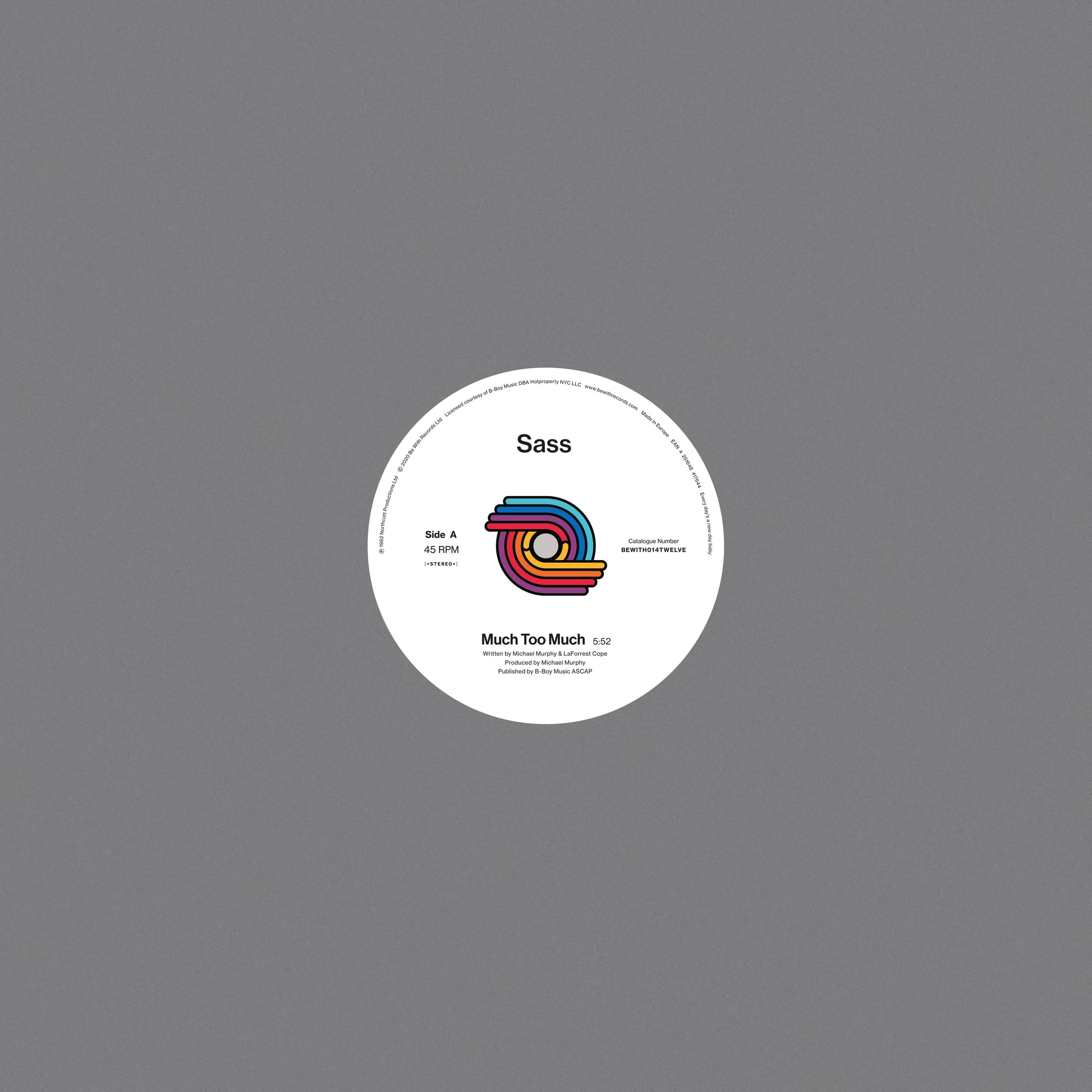 Produced by the band’s vocalist Mic Murphy, who also wrote the track along with fellow band member LaForrest Cope, the band needed just one session to capture “Much Too Much”. The recording studio just so happened to be run by Silvio Tancredi and when the tracks were finished he offered to put them out on his 25 West record label. The vocal version and an instrumental mix were released as a 12" the following year. Mic tells us this meant Sass “were one of the few bands to have a record release while still playing on the club circuit. So the reaction exceeded our expectations at the time”.