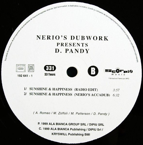 Tracklist: A. Sunshine & Happiness (Nerio's Dubwork Mix), B1. Sunshine & Happiness (Radio Edit), B2. Sunshine & Happiness (Nerio's Accadub)