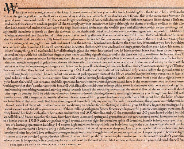 Named Best Album of the 1990s by Magnet Magazine, In the Aeroplane Over the Sea gives us Jeff Mangum's powerful solo acoustic work, full horn-section marches, history, religion, and sex-everything you hoped for and more! Sea Foam Green.