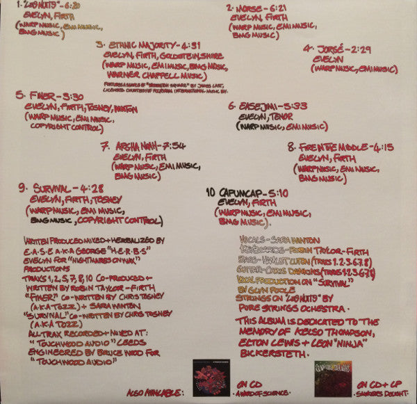 Tracklist: A1. Les Nuits, A2. Morse, A3. Ethnic Majority, B4. Jorgé, B5. Finer, B6. Ease Jimi, C7. Argha Noah, C8. Fire In The Middle, D9. Survival, D10. Capumcap
