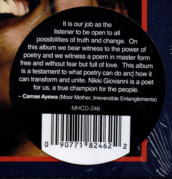 "What does it mean to be a Black woman poet in America writing for liberation? 'I am black alive looking back at you' June Jordan so masterfully said and it speaks volumes to what so many Black women poets in the 70"s and 80"s did for the culture of poetry, speaking volumes to the legacies they built that we can stand on with pride and more agency to express ourselves and for that we are forever thankful. Nikki Giovanni would go on to inspire many great poets and would in her work provide a landscape for future visioning of a better self and world. Here, she shows us what can be done with words on record. Cultivating liberation and healing within the world of poetry live on a record that will stand the test of time." – Camae Ayewa aka Moor Mother (Irreversible Entanglements)
