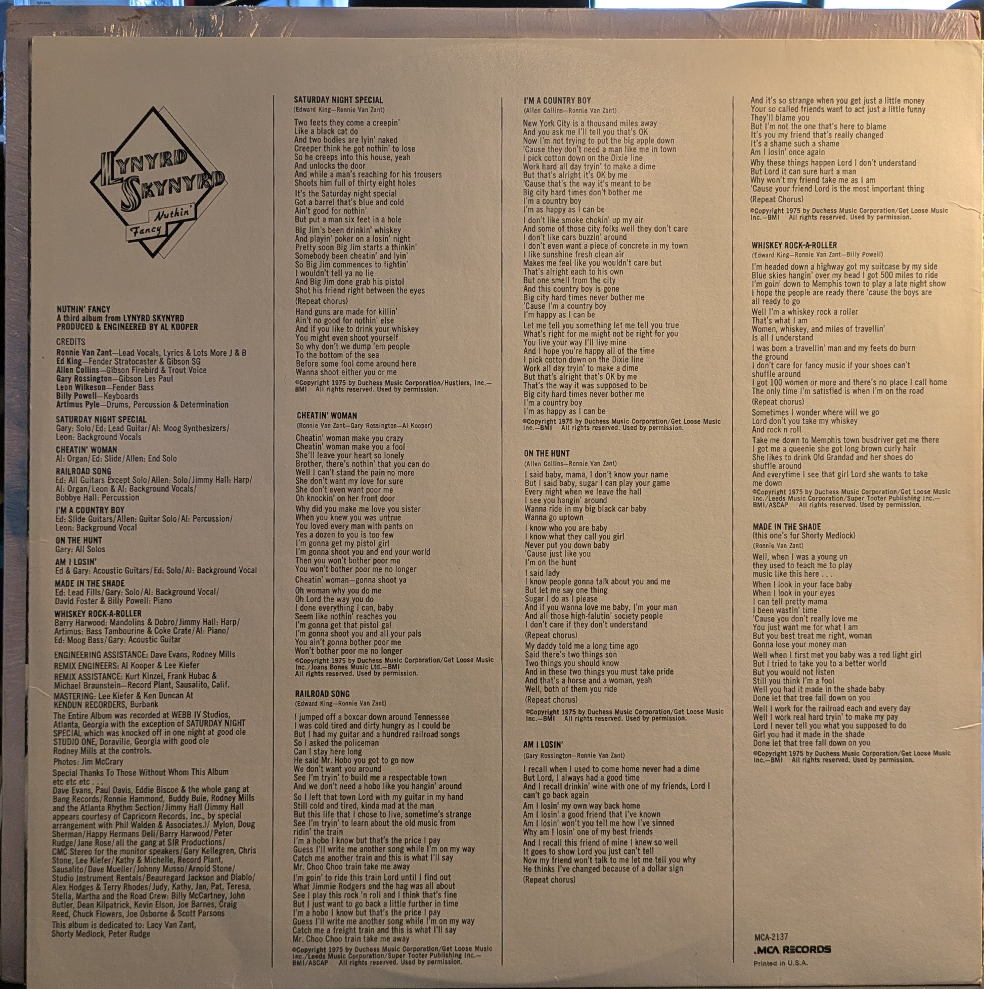 Written-By – Kooper* (tracks: A2), Collins* (tracks: A4, B1), Powell* (tracks: B4), King* (tracks: A1, A3, B4), Rossington* (tracks: A2, B2), Van Zant*