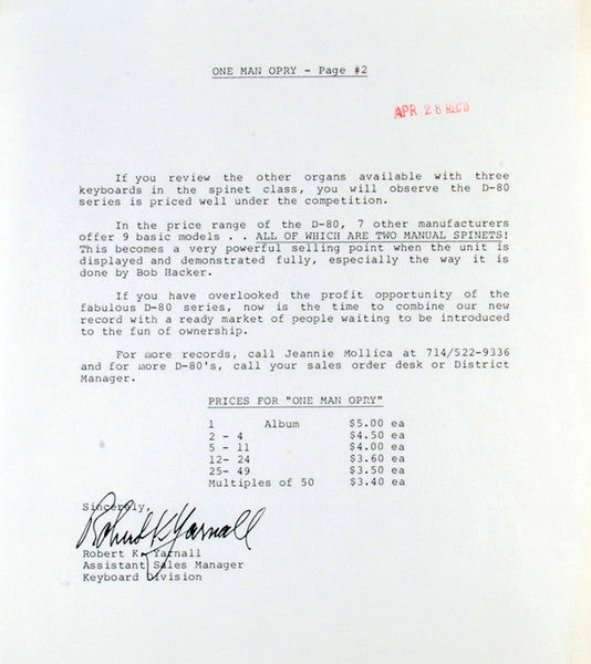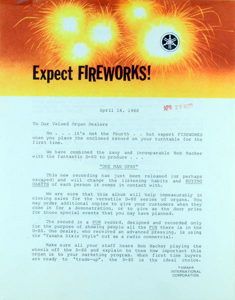 "One Man Opry" Bob Hacker Plays The Yamaha Electone D-80 (VINYL) | Near Mint (NM) Excellent (EX) Get Cheap Vinyl