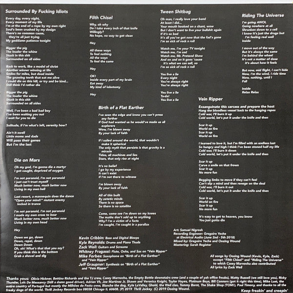 Tracklist: A1. Surrounded by Fucking Idiots, A2. Filth Chisel, A3. Tween Shitbag, A4. Die on Mars, B1. Birth of a Flat Earther, B2. Riding the Universe, B3. Vein Ripper
