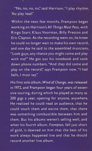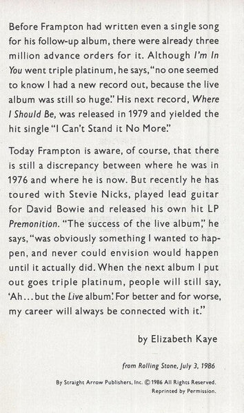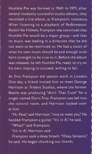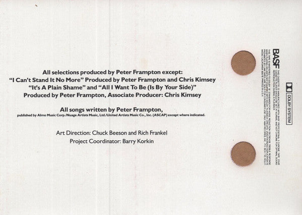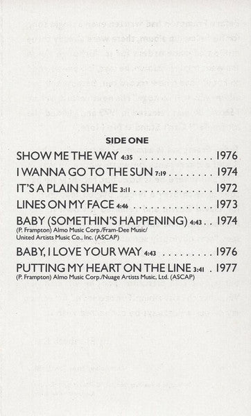Tracklist: A1. Show Me The Way, A2. I Wanna Go To The Sun, A3. It's A Plain Shame, A4. Lines On My Face, A5. Baby (Somethin's Happening), A6. Baby, I Love Your Way, A7. Putting My Heart On The Line, A8. I Can't Stand It No More, B1. All I Want To Be (Is By Your Side), B2. Doobie Wah, B3. (I'll Give You) Money, B4. I'm In You, B5. Do You Feel Like We Do