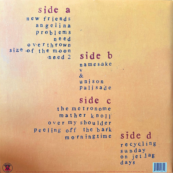 Tracklist: A1. New Friends, A2. Angelina, A3. Problems, A4. Need, A5. Overthrown, A6. Size of the Moon, A7. Need 2, B1. Namesake, B2. V, B3. &, B4. Unison, B5. Palisade, C1. The Metronome, C2. Mather Knoll, C3. Over My Shoulder, C4. Peeling Off The Bark, C5. Morningtime, D1. Recycling, D2. Sunday, D3. On Jet Lag, D4. Days