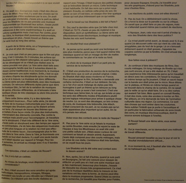 Tracklist: LP-A1. Introduction, LP-A2. C’était Il Y A Très Très Très Longtemps, LP-A3. Cosmogol 999 Carburant De La Fusée Gibi, LP-A4. Au Fond Du Cosmos, LP-A5. Le Lancinant Voyage Dans L'espace, LP-A6. Les Humeurs Géophysiques De La Planète Shadok, LP-A7. Le Devin Plombier Soigne Un Shadok Malade, LP-A8. La Machine À Pomper Dite Cosmopompe, LP-A9. Le Professeur Shadoko Parle De Son Invention, LP-A10. Shadok À Bicyclette Dans Une Route Et Sur Et Sous Et Dans Des Escaliers, LP-B11. Thème Gibi Classique, LP-B12. Air Gibi Hot, LP-B13. Air Gibi Sériel, LP-B14. Menuet Variation, LP-B15. Départ Solennel De La Shadokaravelle, LP-B16. Sérénade À Gégène, LP-B17. Faux Départ, LP-B18. Fête Gibi Et Errance Des Shadoks Dans L'espace, LP-B19. Fuite Dans L'espace, LP-B20. La Planète À Poissons, LP-B21. Guerre Musicale, LP-B22. Ambiance Nouilles, LP-B23. Difficile De Cuisiner Dans L'espace!, 7"-A. Arrivée Des Shadoks Sur Terre, 7"-B. Fuite Des Shadoks