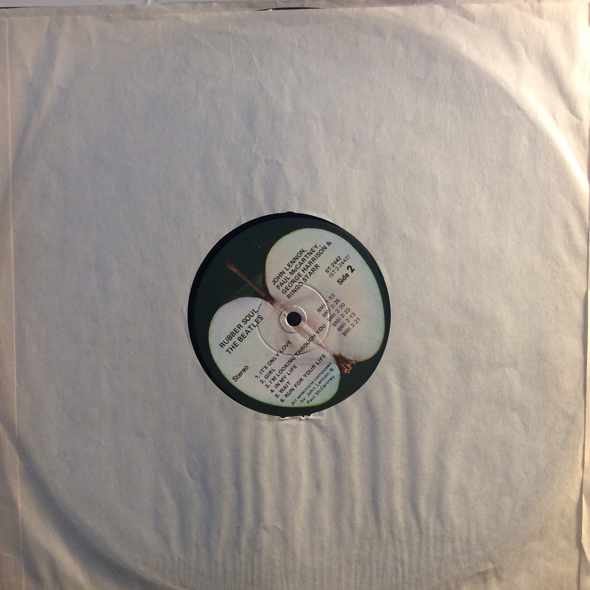Label variation of the 1971 Apple US pressing. "Mfd By Apple Records, Inc." appears on full side. Apple labels in a Capitol jacket with a olive colored 'Rubber Soul'.