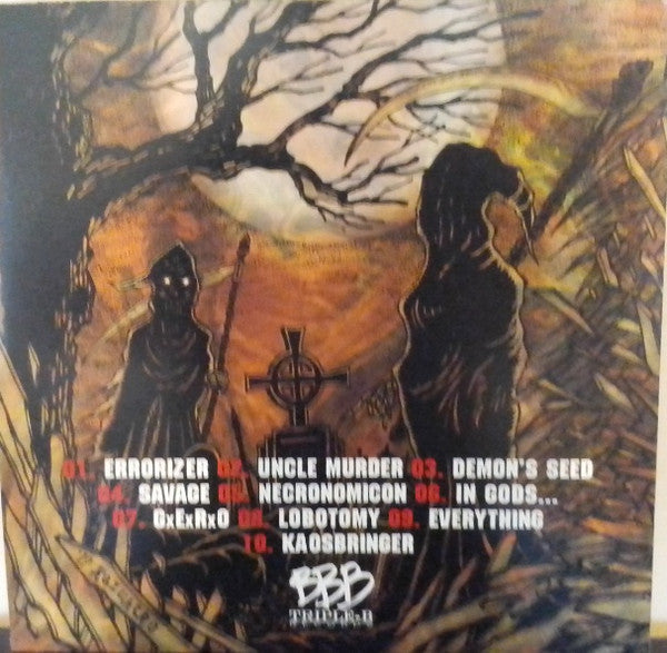 Tracklist: A1. Errorizer, A2. Uncle Murder, A3. Demon's Seed, A4. Savage, A5. Necronomicon, B1. In Gods..., B2. GxExRxO, B3. Lobotomy, B4. Everything, B5. Kaosbringer