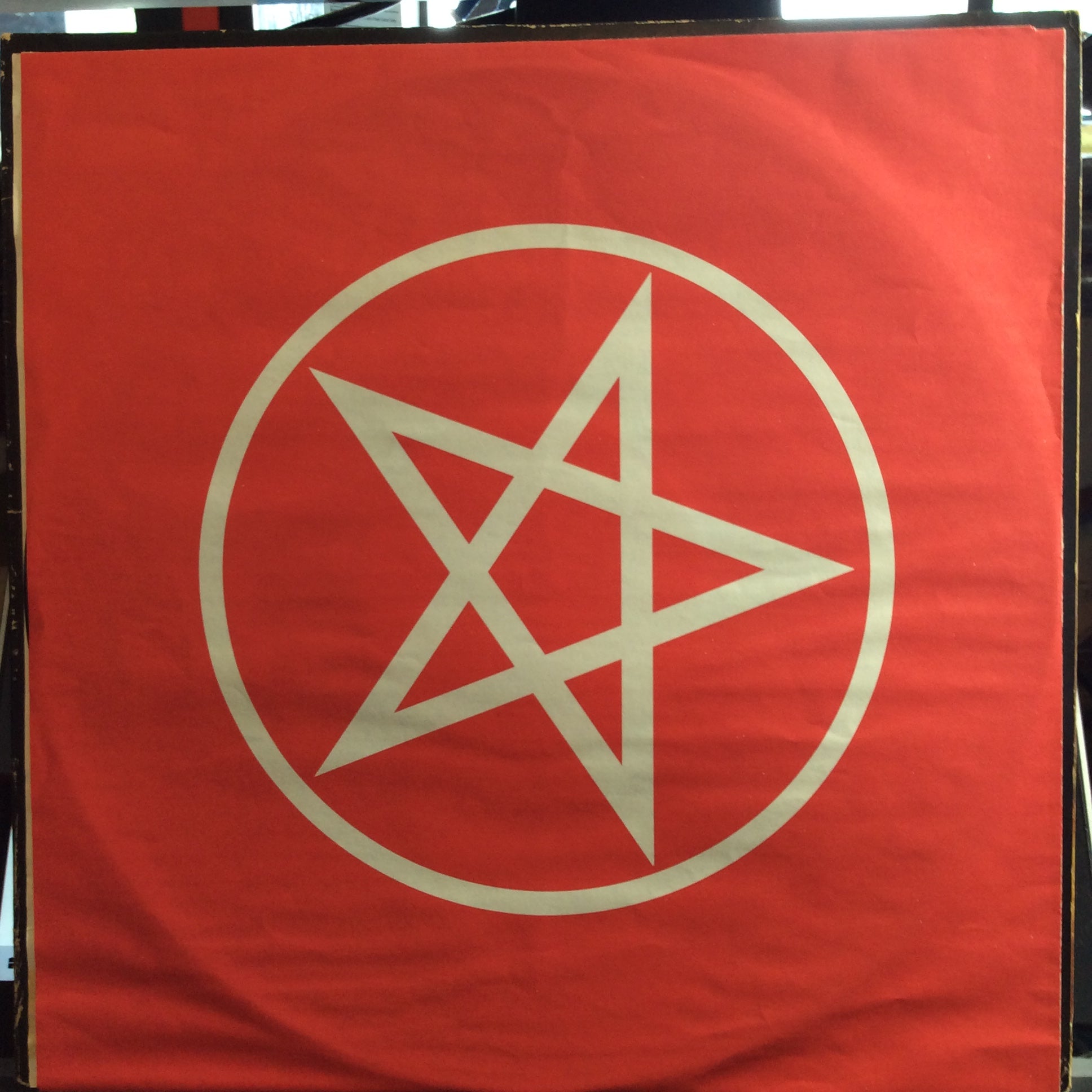 Front sleeve is black with glossy pentagram. Band name and album title in red.
