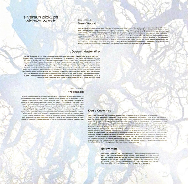 Tracklist: A1. Neon Wound, A2. It Doesn't Matter Why, B1. Freakazoid, B2. Don't Know Yet, B3. Straw Man, C1. Bag Of Bones, C2. Widow's Weeds, C3. Songbirds, D1. Simpatico, D2. We Are Chameleons