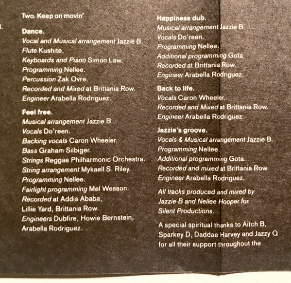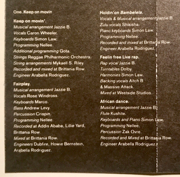 Tracklist: A1. Keep On Movin', A2. Fairplay, A3. Holdin' On (Bambelela), A4. Feeling Free (Live Rap), A5. African Dance, B1. Dance, B2. Feel Free, B3. Happiness (Dub), B4. Back To Life (A Cappella), B5. Jazzie's Groove