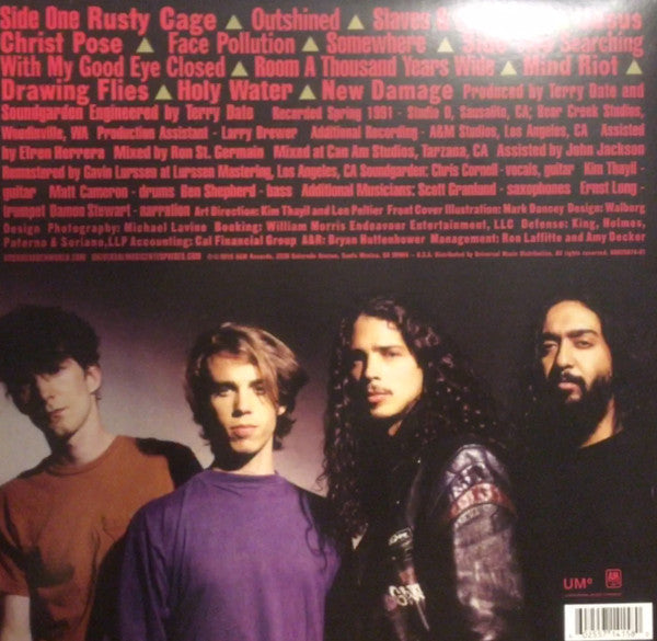 Tracklist: A1. Rusty Cage, A2. Outshined, A3. Slaves & Bulldozers, A4. Jesus Christ Pose, A5. Face Pollution, A6. Somewhere, B1. Searching With My Good Eye Closed, B2. Room A Thousand Years Wide, B3. Mind Riot, B4. Drawing Flies, B5. Holy Water, B6. New Damage