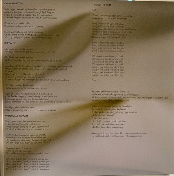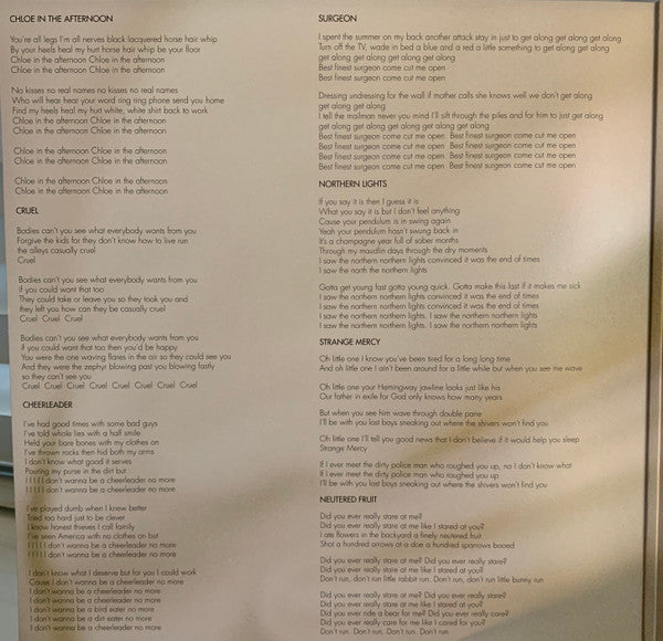 Tracklist: A1. Chloe In The Afternoon, A2. Cruel, A3. Cheerleader, A4. Surgeon, A5. Northern Lights, B1. Strange Mercy, B2. Neutered Fruit, B3. Champagne Year, B4. Dilettante, B5. Hysterical Strength, B6. Year Of The Tiger