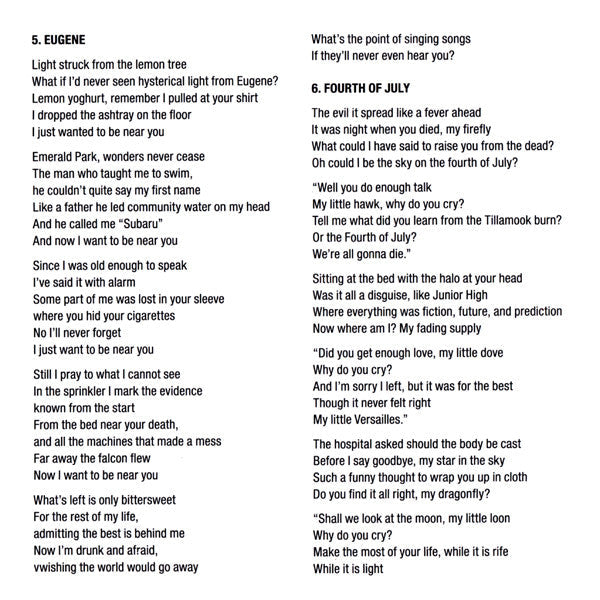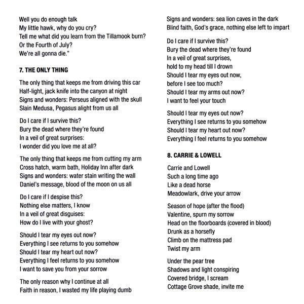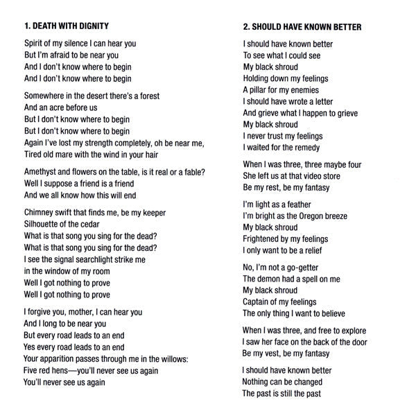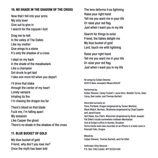 Tracklist: 1. Death With Dignity, 2. Should Have Known Better, 3. All Of Me Wants All Of You, 4. Drawn To The Blood, 5. Eugene, 6. Fourth Of July, 7. The Only Thing, 8. Carrie & Lowell, 9. John My Beloved, 10. No Shade In The Shadow Of The Cross, 11. Blue Bucket Of Gold