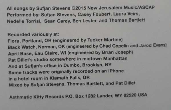 Tracklist: A1. Death With Dignity, A2. Should Have Known Better, A3. All Of Me Wants All Of You, A4. Drawn To The Blood, A5. Fourth of July, B1. The Only Thing, B2. Carrie & Lowell, B3. Eugene, B4. John My Beloved, B5. No Shade In The Shadow Of The Cross, B6. Blue Bucket Of Gold