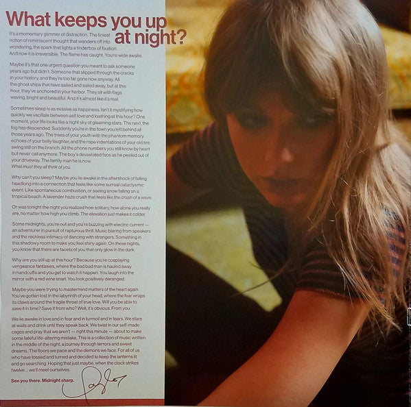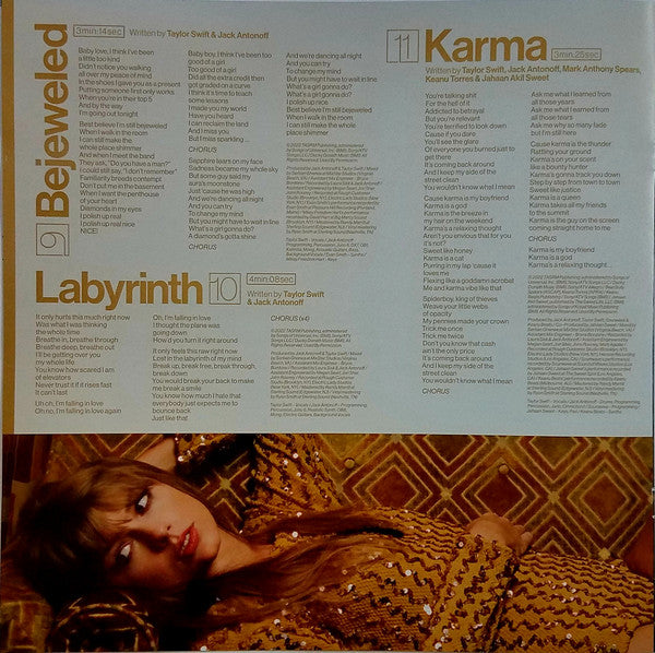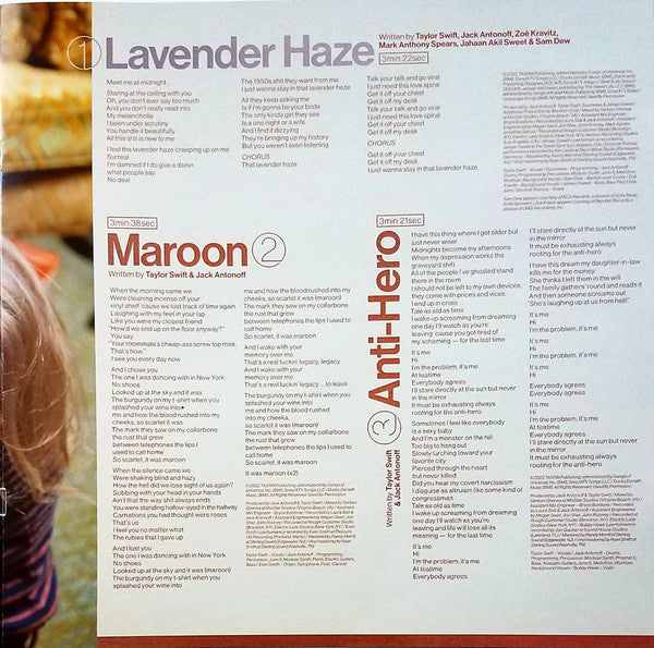 Tracklist: A1. Lavender Haze, A2. Maroon, A3. Anti-Hero, A4. Snow On The Beach, A5. You're On Your Own, Kid, A6. Midnight Rain, B1. Question...?, B2. Vigilante Shit, B3. Bejeweled, B4. Labyrinth, B5. Karma, B6. Sweet Nothing, B7. Mastermind