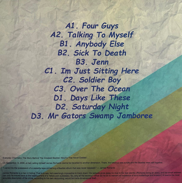 Tracklist: A1. Four Guys, A2. Talking To Myself, B1. Anybody Else, B2. Sick To Death, B3. Jenn, C1. I'm Just Sitting Here, C2. Soldier Boy, C3. Over The Ocean, D1. Days Like These, D2. Saturday Night, D3. Mr Gator's Swamp Jamboree