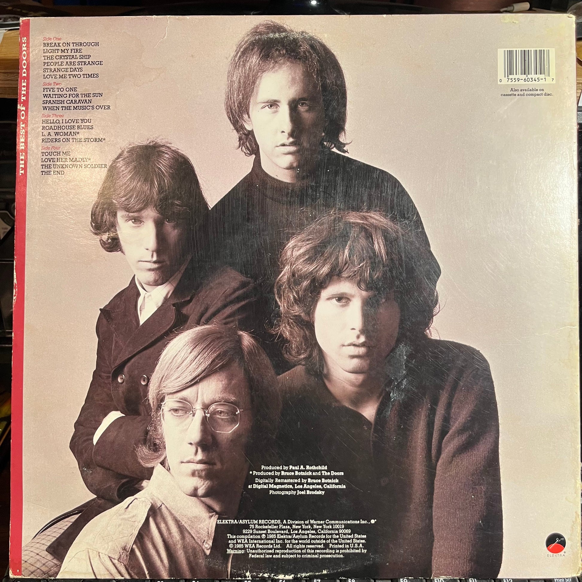 Tracklist: A1. Break On Through, A2. Light My Fire, A3. The Crystal Ship, A4. People Are Strange, A5. Strange Days, A6. Love Me Two Times, B1. Five To One, B2. Waiting For The Sun, B3. Spanish Caravan, B4. When The Music's Over, C1. Hello, I Love You, C2. Roadhouse Blues, C3. L.A. Woman, C4. Riders On The Storm, D1. Touch Me, D2. Love Her Madly, D3. The Unknown Soldier, D4. The End