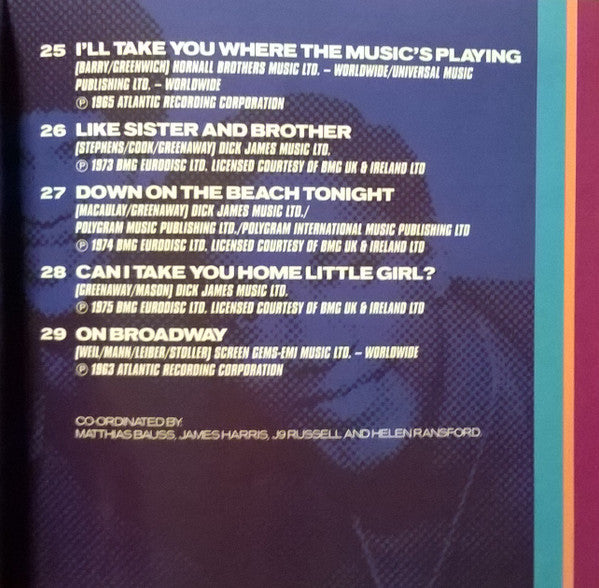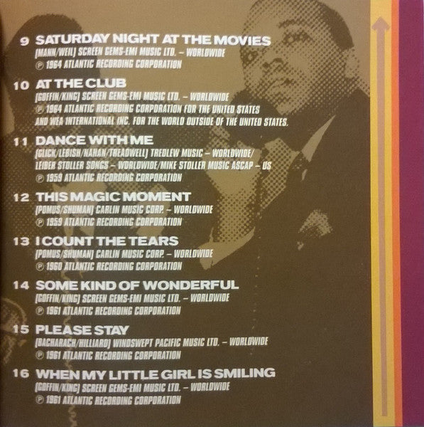 Tracklist: 1. Under The Boardwalk, 2. Kissin' In The Back Row Of The Movies, 3. Up On The Roof, 4. Save The Last Dance For Me, 5. There Goes My First Love, 6. Come On Over To My Place, 7. You're More Than An Number In My Little Red Book, 8. Sweets For My Sweet, 9. Saturday Night At The Movies, 10. At The Club, 11. Dance With Me, 12. This Magic Moment, 13. I Count The Tears, 14. Some Kind Of Wonderful, 15. Please Stay, 16. When My Little Girl Is Smiling, 17. Let The Music Play, 18. Money Honey, 19. Bip Bam, 20. Adorable, 21. Ruby Baby, 22. Drip Drop, 23. There Goes My Baby, 24. I'll Take You Home, 25. I'll Take You Where The Music's Playing, 26. Like Sister And Brother, 27. Down On The Beach Tonight, 28. Can I Take You Home Little Girl, 29. On Broadway