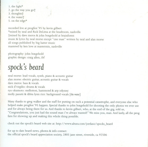 Many thanks to Greg Walker and the staff for putting on such a potential catastrophe, and everyone else who helped make Progfest '95 happen. Special thanks to John Boegehold for shooting the only photos we ever use and for always being there for us. And thanks to Kevin Gilbert, who, at the end of the gig, told us, "Congratulations, you just had the sound man I've always wanted!" We miss you, man. And lastly, all the prog fans for showing up and making this whole thing possible.