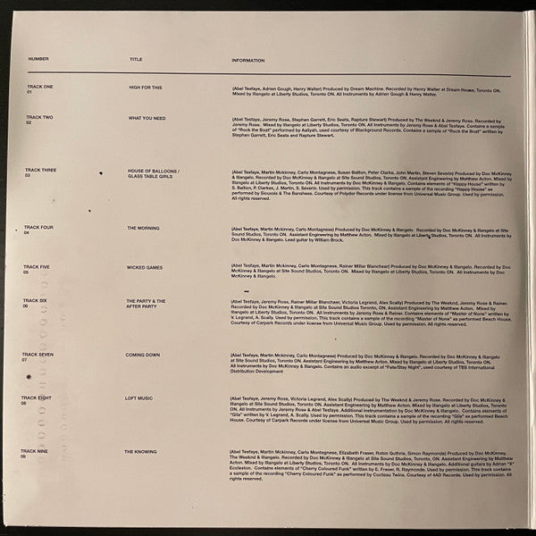 Tracklist: A1. High For This, A2. What You Need, B1. House Of Balloons / Glass Table Girls, B2. The Morning, B3. Wicked Games, C1. The Party & The After Party, C2. Coming Down, D1. Loft Music, D2. The Knowing