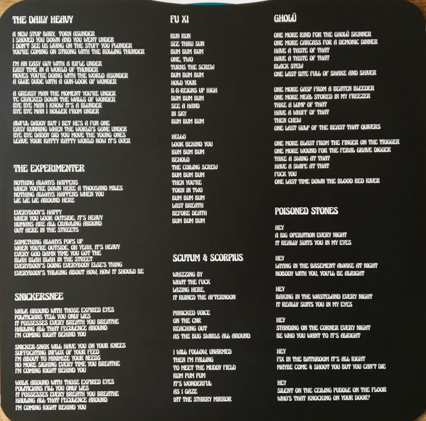 Tracklist: A1. The Daily Heavy, A2. The Experimenter, A3. Face Stabber, A4. Snickersnee, B1. Fu Xi, B2. Scutum & Scorpius, B3. Gholü, C1. Poisoned Stones, C2. Psy-Ops Dispatch, C4. S.S. Luker's Mom, C4. Heart Worm, C5. Together Tomorrow, C6. Captain Loosely, D1. Henchlock