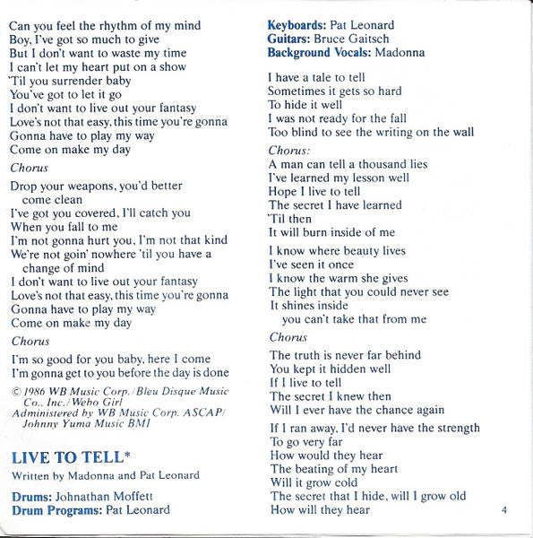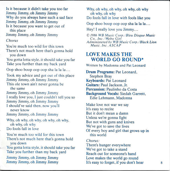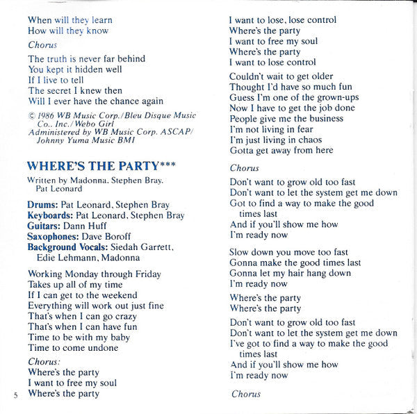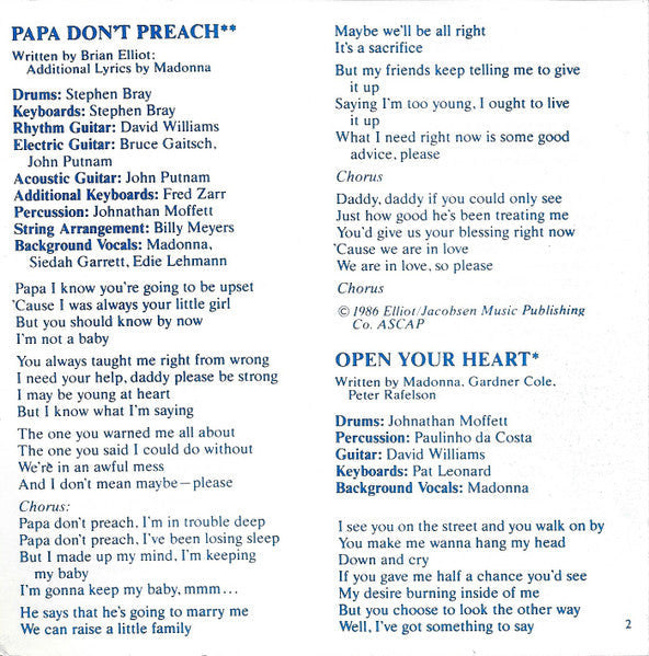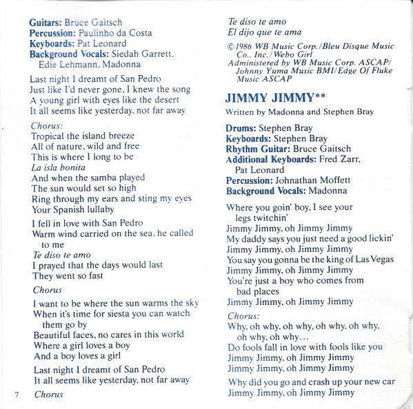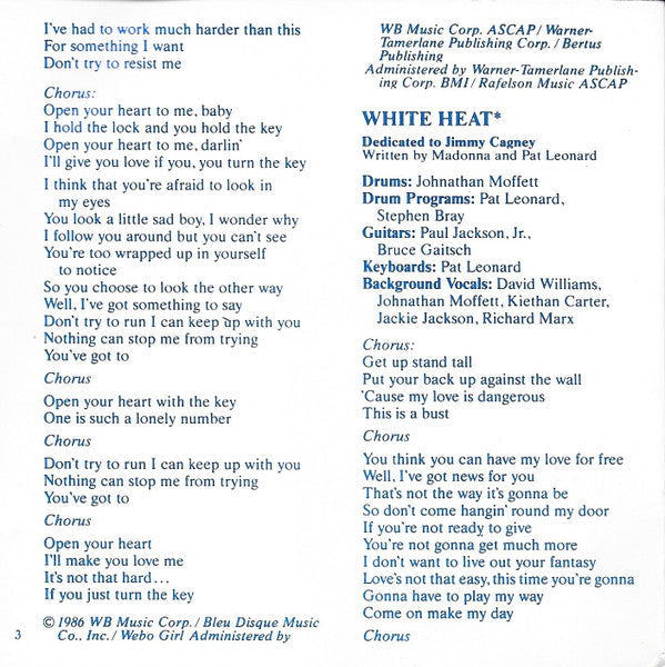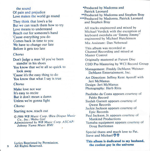 Producer – Madonna, Patrick Leonard (tracks: 2 to 5, 7, 9), Stephen Bray (tracks: 1, 5, 6, 8)