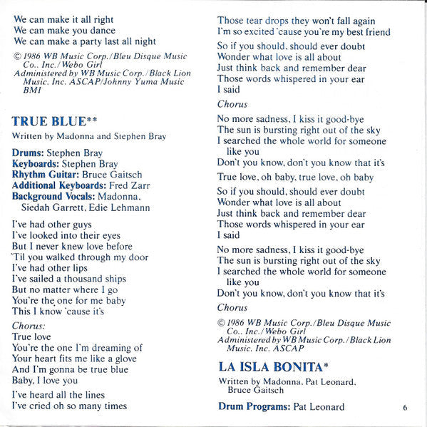 Printed on disc: "Produced by Madonna, Patrick Leonard, Stephen Bray." However, the booklet identifies specific producers by track, as entered above.