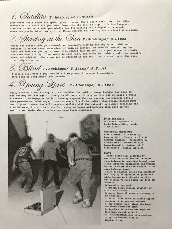 Tracklist: A1. Satellite, A2. Staring At The Sun, A3. Blind, B1. Young Liars, B2. Mister Grieves