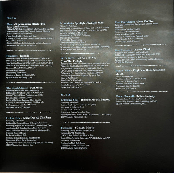 Tracklist: A1. Supermassive Black Hole, A2. Decode, A3. Full Moon, A4. Leave Out All The Rest, A5. Spotlight (Twilight Mix), A6. Go All The Way (Into The Twilight), B1. Tremble For My Beloved, B2. I Caught Myself, B3. Eyes On Fire, B4. Never Think, B5. Flightless Bird, American Mouth, B6. Bella’s Lullaby