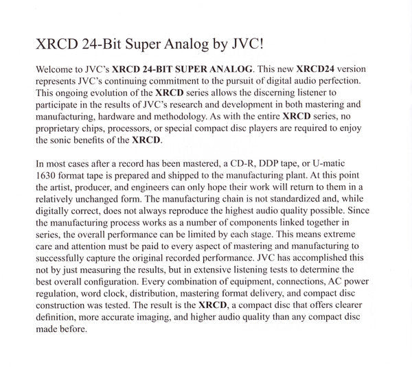 Released as a digibook with a digipak style tray and an attached 20-page booklet containing original liner notes, photographs, illustrated details of the XRCD 24-Bit process, a page on Audio Wave Music, and original and reissue credits.