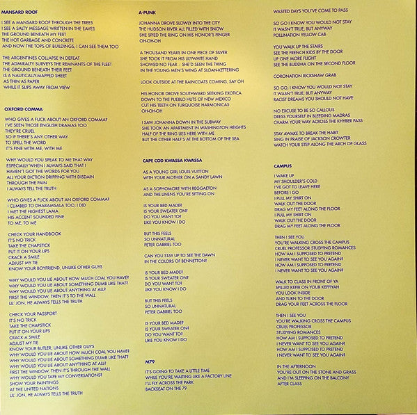 Tracklist: A1. Mansard Roof, A2. Oxford Comma, A3. A-Punk, A4. Cape Cod Kwassa Kwassa, A5. M79, B1. Campus, B2. Bryn, B3. One (Blake's Got A New Face), B4. I Stand Corrected, B5. Walcott, B6. The Kids Don't Stand A Chance