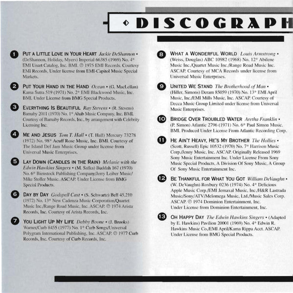 Tracklist: 1. Put A Little Love In Your Heart, 2. Put Your Hand In The Hand, 3. Everything Is Beautiful, 4. Me And Jesus, 5. Lay Down (Candles In The Rain), 6. Day By Day, 7. You Light Up My Life, 8. What A Wonderful World, 9. United We Stand, 10. Bridge Over Troubled Water, 11. He Ain't Heavy, He's My Brother, 12. Be Thankful For What You Got, 13. Oh Happy Day, 14. Morning Has Broken, 15. Superstar, 16. I'd Like To Teach The World To Sing (In Perfect Harmony), 17. I Don't Know How To Love Him, 18. Why Me, 19. Joy To The World, 20. Spirit In The Sky