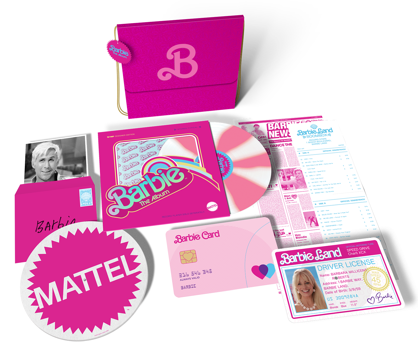 VMP Designer Handbag Package, 7" X 10" Driver’s License Shaped Picture Disc, 7" X 8" Photographic Flexi-Disc, “Album Receipt," Tracklist And Song Info, “Barbie Card," Barbie News 11" X 18" Lyric Sheet, 12" Slipmat