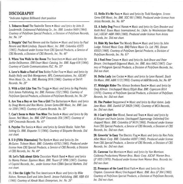 Tracklist: 1. Tobacco Road, 2. Steppin' Out, 3. When You Walk In The Room, 4. Love's Made A Fool Of You, 5. With A Girl Like You, 6. Are You A Boy Or Are You A Girl, 7. Can't Seem To Make You Mine, 8. Psycho, 9. 5 D (Fifth Dimension), 10. Let's Talk About Girls, 11. I See The Light, 12. Hello It's Me, 13. A Salty Dog, 14. Ride My See-Saw, 15. I Feel Free, 16. Delta Lady, 17. Midnight Rider, 18. The Pusher, 19. I Can't Quit Her, 20. Groovin' Is Easy, 21. Caravan, 22. Presence Of The Lord