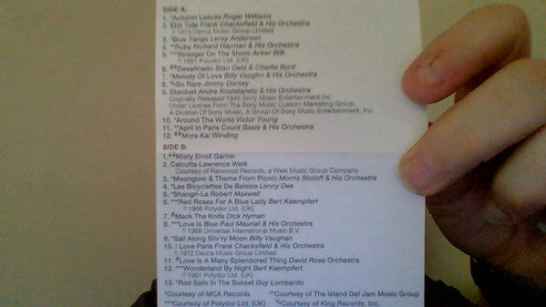 Tracklist: . Cassette 1 (3FC-1) [Universal Music Special Markets B0001914-04], A1. Autumn Leaves, A2. Ebb Tide, A3. Blue Tango, A4. Ruby, A5. Stranger On The Shore, A6. Desafinado, A7. Melody Of Love, A8. So Rare, A9. Stardust, A10. Around The World, A11. April In Paris, A12. More, B1. Misty, B2. Calcutta, B3. Moonglow & Theme From Picnic, B4. Les Bicyclettes De Belsize, B5. Shangri-La, B6. Red Roses For A Blue Lady, B7. Mack The Knife, B8. Love Is Blue, B9. Sail Along Silv'ry Moon, B10. I Love Paris, B11. Love Is A Many Splendored Thing, B12. Wonderland By Night, B13. Red Sails In The Sunset, . Cassette 2 (3FC-2) [BMG Special Products DMK13569], C1. The Song From Moulin Rouge (Where Is Your Heart), C2. Cherry Pink And Apple Blossom White, C3. Moon River, C4. La Vie En Rose, C5. Holiday For Strings, C6. Maria Elena, C7. Theme From "Summer Of '42 (The Summer Knows)", C8. April In Portugal, C9. Delicado, C10. Three Coins In The Fountain, C11. Perfidia: Cancion Bolero, C12. Lisbon Antigua, D1. Love Theme From Romeo & Juliet, D2. Exodus (Theme From Otto Premingers' "Exodus"), D3. Melancholy Serenade, D4. Moonlight And Roses, D5. Charmaine, D6. The Poor People Of Paris, D7. Candian Sunset, D8. Patricia, D9. Theme From Love Story, D10. Last Date, D11. Somewhere My Love, D12. Unchained Melody, D13. Theme From "A Summer Place"