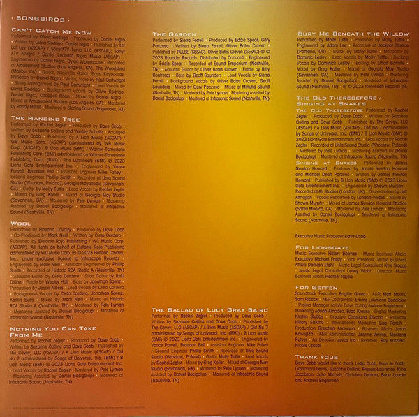 Tracklist: SB1. Can’t Catch Me Now, SB2. The Hanging Tree, SB3. Wool, SB4. Nothing You Can Take From Me , SB5. The Gardens , SB6. The Ballad Of Lucy Gray Baird , SB7. Bury Me Beneath The Willow , SB8. The Old There Before / Singing At Snakes, S1. Burn Me Once, S2. District 12 Stomp, S3. Nothing You Can Take From Me (Boot Stomping Version), S3. Cabin Song, S4. Pure As The Driven Snow, S5. Winter’s Come And Gone, S6. Keep On The Sunny Side