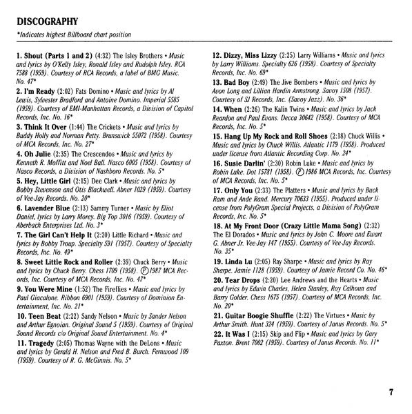 Tracklist: 1. Shout (Parts 1 And 2), 2. I'm Ready, 3. Think It Over, 4. Oh Julie, 5. Hey, Little Girl, 6. Lavender Blue, 7. The Girl Can't Help It, 8. Sweet Little Rock And Roller, 9. You Were Mine, 10. Teen Beat, 11. Tragedy, 12. Dizzy, Miss Lizzy, 13. Bad Boy, 14. When, 15. Hang Up My Rock And Roll Shoes, 16. Susie Darlin', 17. Only You, 18. At My Front Door (Crazy Little Mama Song), 19. Linda Lu, 20. Tear Drops, 21. Guitar Boogie Shuffle, 22. It Was I