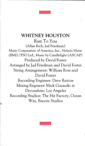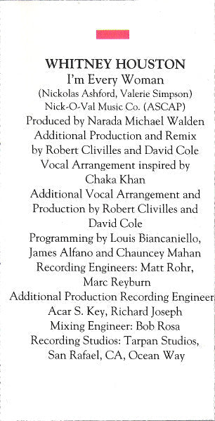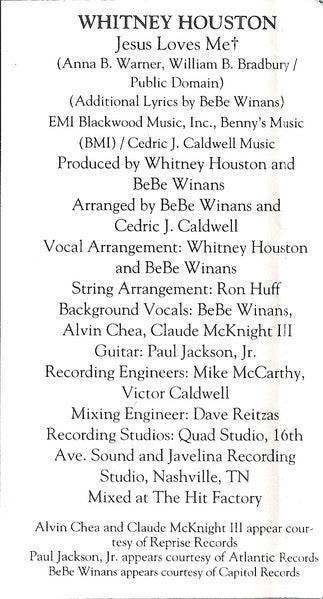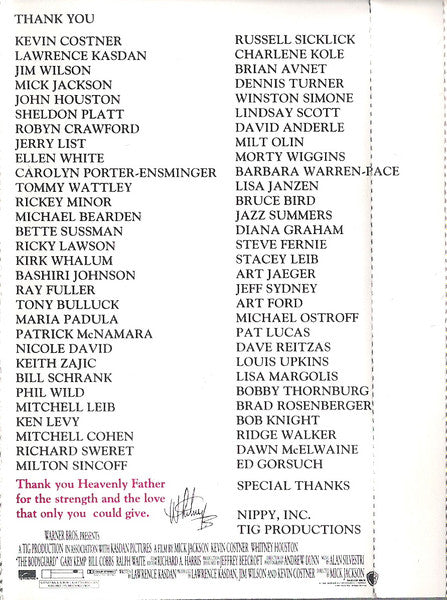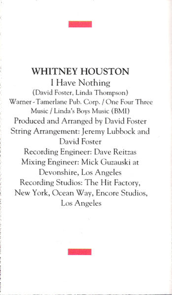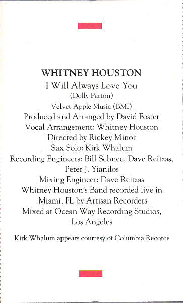 Tracklist: A1. I Will Always Love You, A2. I Have Nothing, A3. I'm Every Woman, A4. Run To You, A5. Queen Of The Night, A6. Jesus Loves Me, B1. Even If My Heart Would Break, B2. Someday (I'm Coming Back), B3. It's Gonna Be A Lovely Day, B4. (What's So Funny 'Bout) Peace, Love And Understanding, B5. Theme From The Bodyguard, B6. Trust In Me