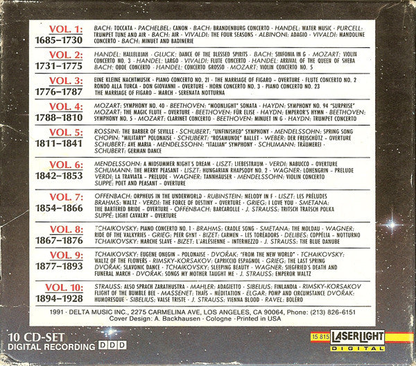 Tracklist: . Vol. 1 - The Top 10 Of Classical Music 1685-1730, 1-1. Toccata In D Minor, 1-2. Canon In D, 1-3. Brandenburg Concerto No. 3, 1st Movement, . Water Music, Suite No. 2 In D: , 1-5. Trumpet Tune And Air, 1-6. Air (From Orchestral Suite No. 3 In D), . The Four Seasons - Spring: , 1-8. Adagio, . Mandolin Concerto In C, Rv 425: , . Minuet And Badinerie (From Orchestral Suite No. 2):, . Vol. 2 - The Top 10 Of Classical Music 1731-1775, 2-1. Hallelujah (From "Messiah"), 2-2. Dance Of The Blessed Spirits (From "Orpheus And Eurydice"), 2-3. Sinfonia In G (From "Christmas Oratorio"), 2-4. Violin Concerto No. 3 In G, 1st Movement, 2-5. Largo (From "Xerxes"), 2-6. Flute Concerto In G Minor "La Notte", VI. Allegro, 2-7. Arrival Of The Queen Of Sheba (From "Solomon"), 2-8. Oboe Concerto In D Minor, 2nd Movement, . Concerto Grosso In A Minor Op. 6 No. 4: , 2-10. Violin Concerto No. 5 In A, 2nd Movement, . Vol. 3 - The Top 10 Of Classical Music 1776-1787, 3-1. Eine Kleine Nachtmusik, 1st Movement, 3-2. Piano Concerto No. 21 In C, 2nd Movement ("Elvira Madigan"), 3-3. The Marriage Of Figaro - Overture, 3-4. Flute Concerto No. 2 In D, 2nd Movement, 3-5. Rondo Alla Turca, From Piano Sonata In A, 3-6. Don Giovanni - Overture, 3-7. Horn Concerto No. 3 In E Flat, 2nd Movement, 3-8. Piano Concerto No. 23 In A, 1st Movement, 3-9. The Marriage Of Figaro - March, . Serenata Notturna, . Vol. 4 - The Top 10 Of Classical Music 1788-1810, 4-1. Symphony No. 40, 1st Movement, 4-2. "Moonlight" Sonata, 1st Movement, 4-3. Symphony No. 94, "Surprise", 2nd Movement, 4-4. The Magic Flute - Overture, 4-5. Für Elise, 4-6. Emporor's Hymn, From String Quartet In C, 4-7. Symphony No. 5, 1st Movement, 4-8. Clarinet Concerto In A, 2nd Movement, 4-9. Minuet In G, 4-10. Trumpet Concerto In E Flat, 3rd Movement, . Vol. 5 - The Top 10 Of Classical Music 1811-1841, 5-1. The Barber Of Seville - Overture, 5-2. Symphony No. 8 In B Minor, "Unfinished", 2nd Movement, 5-3. Spring Song, 5-4. Polonaise In A, Op. 40 No. 3, "Military", 5-5. Ballet Music In G, From "Rosamunde", 5-6. Der Freischütz - Overture, 5-7. Ave Maria, 5-8. Symphony No. 4 In A, "Italian", 1st Movement, 5-9. Träumerei, 5-10. German Dance No. 1, . Vol. 6 - The Top 10 Of Classical Music 1842-1853, 6-1. Wedding March, From "A Midsummer Night's Dream", 6-2. Liebestraum No. 3 In A Flat, 6-3. Nabucco - Overture, 6-4. The Merry Peasant, 6-5. Hungarian Rhapsody No. 2, 6-6. Lohengrin - Prelude To Act 3, 6-7. La Traviata - Prelude To Act No. 1, 6-8. Tannhäuser - Arrival Of The Guests At Wartburg, 6-9. Violin Concerto In E Monior, 2nd Movement, 6-10. Poet And Peasant - Overture, . Vol. 7 - The Top 10 Of Classical Music 1854-1866, 7-1. Orpheus In The Underworld - Overture, 7-2. Melody In F, 7-3. Les Préludes, 7-4. Waltz In A Flat, 7-5. The Force Of Destiny - Overture, 7-6. I Love You, 7-7. The Bartered Bride, 7-8. Barcarolle, From "The Tales Of Hoffman", 7-9. Tritsch Tratsch Polka, 7-10. Light Cavalry - Overture, . Vol. 8 - The Top 10 Of Classical Music 1867-1876, 8-1. Piano Concerto No. 1 In B Flat Minor, 1st Movement (Excerpt), 8-2. Cradle Song, 8-3. The Moldau, 8-4. Ride Of The Valkyries; From The "Valkyrie", 8-5. Morning, From "Peer Gynt", 8-6. Les Toréadors, From "Carmen", 8-7. Notturno, From "Coppélia", 8-8. Marche Slave, Op. 31, 8-9. L'Arlésienne - Intermezzo, 8-10. The Blue Danube - Waltz, . Vol. 9 - The Top 10 Of Classical Music 1877-1893, 9-1. Polonaise, From "Eugene Onegin", 9-2. Symphony No. 9, "From The New World", 2nd Movement, 9-3. Waltz Of The Flowers, From "The Nutcracker", 9-4. Alborado, "Capriccio Espagnol", 9-5. The Last Spring, 9-6. Slavonic Dance No. 2, 9-7. The Sleeping Beauty - Introduction, 9-8. Siegfried's Death And Funeral March; From "Twilight Of The Gods", 9-9. Songs My Mother Taught Me, 9-10. Emperor Waltz, . Vol. 10 - The Top 10 Of Classical Music 1894-1928, 10-1. Also Sprach Zarathustra - Fanfare, 10-2. Symphony No. 5 - Adagietto, 10-3. Finlandia, 10-4. Dance Of The Bumble Bee, 10-5. Méditation, From "Thaïs", 10-6. Pomp And Circumstance - March No. 1, 10-7. Humoresque, 10-8. Valse Triste, 10-9. Vienna Blood - Waltz, 10-10. Boléro