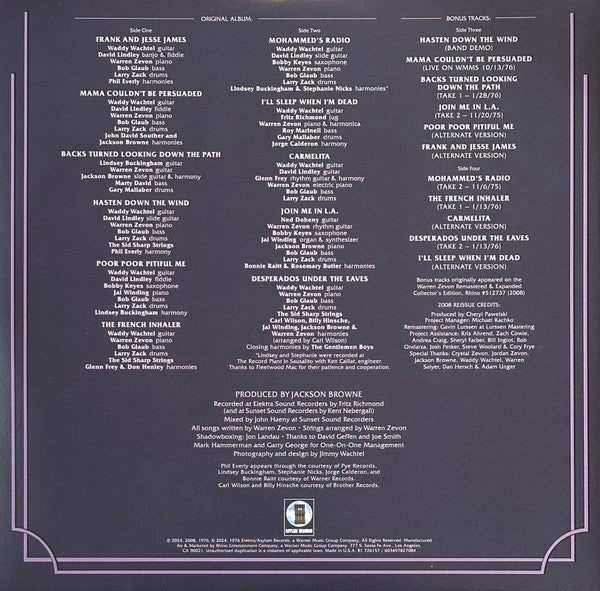 Tracklist: . Original Album:, A1. Frank And Jesse James, A2. Mama Couldn't Be Persuaded, A3. Backs Turned (Looking Down The Path), A4. Hasten Down The Wind, A5. Poor Poor Pitiful Me, A6. The French Inhaler, B1. Mohammed's Radio, B2. I'll Sleep When I'm Dead, B3. Carmelita, B4. Join Me In L.A., B5. Desperados Under The Eaves, . Bonus Tracks:, C1. Hasten Down The Wind (Band Demo), C2. Mama Couldn't Be Persuaded (Live On WMMS), C3. Backs Turned Looking Down The Path (Take 1), C4. Join Me In L.A. (Take 2), C5. Poor Poor Pitiful Me (Alternate Version), C6. Frank And Jesse James (Alternate Version), D1. Mohammed's Radio (Take 2), D2. The French Inhaler (Take 1), D3. Carmelita (Alternate Version), D4. Desperados Under The Eaves (Take 2), D5. I'll Sleep When I'm Dead (Alternate Version)