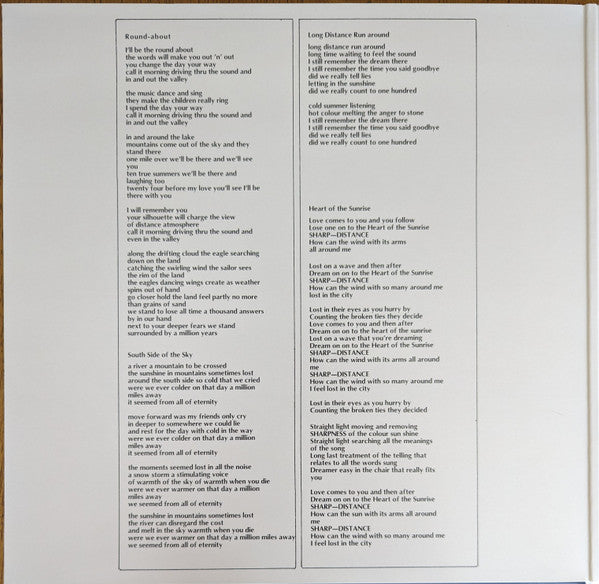 Fragile is the fourth studio album from progressive rock band Yes, originally released in November 1971 on Atlantic Records. It is their first album recorded with keyboardist Rick Wakeman in the band's line-up after Tony Kaye was fired for having a lack of interest in learning more electronic keyboards. Formed of nine tracks, four are group performances while the remaining five are solo features written by each member. It's cover was designed by Roger Dean, who would design their future band logo, stage sets, and many of their future album covers. Fragile received a positive reception upon it's release and was a commercial and critical success, reaching #4 on the US Billboard Top LPs chart and #7 on the UK Albums Chart. "Roundabout" was released as a single in the US which reached #13 and is one of the band's best known songs.